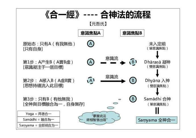 以下是「Samyama全神合一」的:三步驟操作流程示意圖+意識焦點轉換流程示意圖。