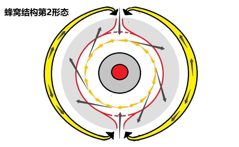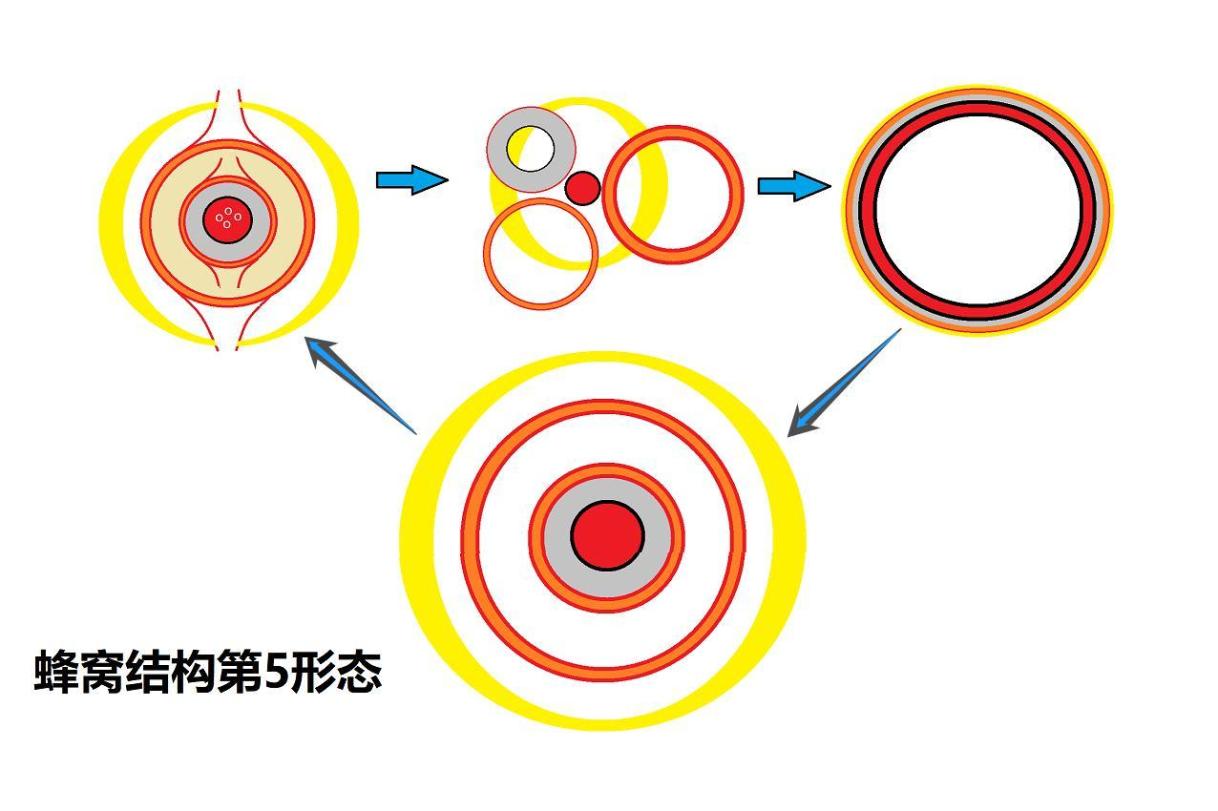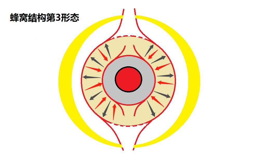 末期形態——這些週邊的因數又慢慢的吸收回去。因為之前的過濾高壓取消,所以能慢慢的游離回去。這時蜂窩球已經煥然一新,形成清晰的三層結構:核心結構、次核心結構、游離結構。整體佈局比較明朗。三個形態會形成交替狀,繼續高壓-減壓-高壓-減壓,相當於一種AI自動過濾系統。