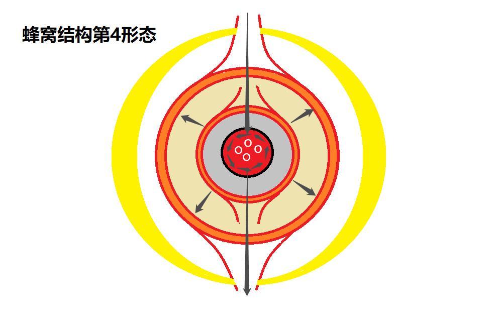 末期形態——這些週邊的因數又慢慢的吸收回去。因為之前的過濾高壓取消,所以能慢慢的游離回去。這時蜂窩球已經煥然一新,形成清晰的三層結構:核心結構、次核心結構、游離結構。整體佈局比較明朗。三個形態會形成交替狀,繼續高壓-減壓-高壓-減壓,相當於一種AI自動過濾系統。
